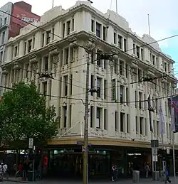 Its headquarters, the Leviathan Building, on the prominent Melbourne corner of Bourke Street and Swanston Street, was designed and realized in 1912-13 by Bates, Pebbles & Smart, in an eclectic style with Beaux Arts form, but stylized classical elements, and Edwardian Baroque details, including the most prominent feature being over-scaled Mannerist scrolled brackets supporting a large cornice.[2]