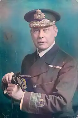 He served in World War I as Captain of HMS Hercules, which he commanded at the Battle of Jutland in 1916,[4] and then as Captain of HMS Benbow from later that year; he then took responsibility for laying a mine barrage across the North Sea[1] from a base at Grangemouth.[5]