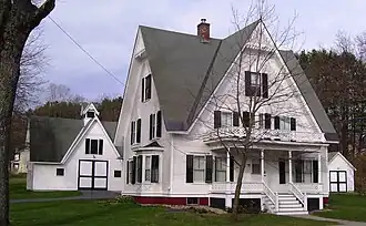 The Grout House stands at the northwest corner of Bonnyvale Road and Western Avenue (Vermont Route 9), on a generous lot in the village of West Brattleboro. It is a 1-3/4 story wood-frame structure, with a steeply pitched cross-gable roof that shelters a full second floor and a smaller attic. The front facade, facing Western Avenue, is five bays wide on the ground floor, three on the second, and one on the third. A single-story porch extends across the center three bays, supported by cruciform posts, and sporting stickwork balustrades at the ground floor and around the roof. Windows on the upper levels have elongated pyramidal hood decorations, roughly matching in angle the roof pitch. There is Stick style decorate woodwork at the gable peaks.[2]