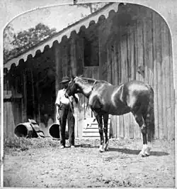 Under the name of "Darley" Lexington easily won his first two races for Warfield and his partner, "Burbridge's Harry", a.k.a. Harry Lewis, a former slave turned well-known horse trainer. Lewis, being black, was not allowed to enter "Darley" in races in his own name, so the horse ran in Warfield's name and colors.[3] Darley caught the eye of Richard Ten Broeck who asked Warfield to name his price. "Darley", the son of Boston, and Jarret, Lewis's son who was still enslaved, were sold in 1853 to Ten Broeck acting on behalf of a syndicate who would rename him Lexington. Affixed to Lexington's pedigree Warfield wrote: "The colt was bred by me, as was also his dam, which I now and will ever, own...E. Warfield."