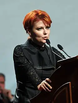 In March 2013 she was elected as the President of the Craiova Organization of PSD.[26] On 20 April 2013 she was elected one of the co-presidents of the Women's Organization of PSD (together with Ecaterina Andronescu, Corina Crețu, Gabriela Firea and Rovana Plumb).[27] In January 2017, she resigned as mayor of Craiova in order to take office as Minister of Labor in the cabinet of Sorin Grindeanu.[28]