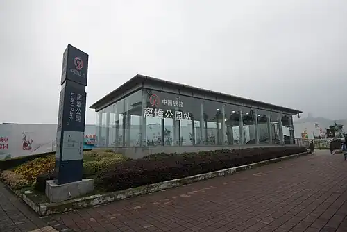 The Lidui Park railway station (Chinese: 离堆公园站; pinyin: Líduī Gōngyuán Zhàn) is an underground railway station. The former name is Guanxian Ancient Town railway station. The railway station is on the Lidui Branch Line of Chengdu–Dujiangyan Intercity Railway in Dujiangyan, Chengdu, Sichuan, China. This railway station is 12192 square metres.[1]