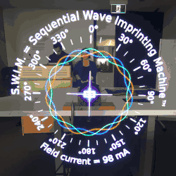 Photographs of a representation of an electromagnetic radio wave with S.W.I.M. (Sequential Wave Imprinting Machine), which represents traveling waves in stationary spacetime coordinates (i.e. as a "sitting wave")[12]