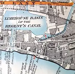 Near its Limehouse end the Cut was widened to form a basin with an island in it. This was the first Limehouse basin, made 25 years before the better known Regent's Canal Dock. The reason for this is described below, see "The Island in the Cut and its mills".