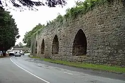 The two sets of limekilns are located on the south side of a private access road to the Kiln Park holiday park, off the A4139 road between Tenby and the village of Penally. The main set of six large kilns (Grade II* listed) are built against the north face of a quarry and are faced with dressed limestone. The exterior wall has five arched entrances and four ventilation windows. A vaulted passageway runs the entire length of the interior, which used to contain a small railway.[1][2]