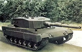 In 1984, the Spanish Ministry of Defense declared its intent to set aside 120 billion pesetas (1.1 billion U.S. dollars) for a future tank program and attracted interest from five foreign companies.[7] German company Krauss-Maffei and Spanish company Santa Bárbara presented a joint bid in mid-1984 that would produce a tank based on 1970s technology. The French government proposed to cooperate with Spain in designing a tank complete with new technology—France would later develop this programme on its own as the Leclerc. However, the French admitted that there would be restrictions placed on Empresa Nacional Santa Bárbara when it came to exporting the tank.[8] The Italian government proposed a similar deal for a cooperative tank design. The American company General Dynamics and British company Vickers offered the M1 Abrams and Valiant, respectively; the Spanish government rejected their offers the following year because of the low likelihood of local production and export of the tank. By late 1985, the only offers still under consideration were those from the German-Spanish collaboration and the French and Italian governments.[9]