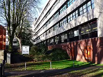 The new building was designed by John Roberts Associates in the Brutalist style, built in concrete and glass and was completed in spring 1973.[8][9] The design involved a main frontage of 14 bays facing Orchard Street with another long wing extending eastwards behind the left-hand end of the Orchard Street elevation. The main frontage was faced with alternating bands of concrete and dark-framed windows. The fifth and sixth bays from the left featured deeply recessed openings on the ground floor with a glass balcony above bearing the city coat of arms.[10] The design was strongly criticised by the architectural historian, Nikolaus Pevsner, who said it had "absolutely nothing to recommend it ... it offends the Lincoln skyline and is an insult to the civic pride befitting the seat of local government."[11]