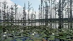 Lily pads and a cypress grove on the lake in Cane Creek State Park