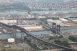 The bridge and its sister, the Lincoln Highway Hackensack River Bridge are important components in the transportation of goods in the Port of New York and New Jersey. Since the nearby Pulaski Skyway prohibits trucks they often use Route 1/9 Truck to serve traffic at Port Newark, Newark Airport, the Holland Tunnel and the numerous intermodal freight transport facilities in the New Jersey Meadowlands. The NJDOT is considering building a new bridge along the alignment of the now defunct PD Draw, the former Newark and New York Branch bridge at mile point 1.2.[13][14][15] Studies are being conducted as part of an extensive project conceived to facilitate freight transshipment through the port known as Portway. A new bridge could include a rail component. The dual bridge combination would allow for two one-way crossings of the Passaic.[16]