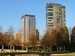 The project was originally conceived in the late 1990s by Westbank Projects, a Canadian firm, and Lendlease of Australia. The 27-story office building was to be occupied by Drugstore.com while a separate 42-story building would have a Westin hotel and condominiums. Following the dot-com bubble, Drugstore.com backed out of its lease agreement and other tenants were unable to commit to their previous terms. Opus Northwest won an auction for the project rights, but later sold their stake to Kemper Freeman in 2003 for $40 million.[4][5] The first phase was completed in November 2005 with Eddie Bauer and Microsoft as office tenants.[6][7]