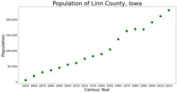 Linn County is a county located in the U.S. state of Iowa. As of the 2020 census, the population was 230,299,[1] making it the second-most populous county in Iowa. The county seat is Cedar Rapids.[2] Linn County is named in honor of Senator Lewis F. Linn of Missouri.[3] Linn County is included in the Cedar Rapids, IA Metropolitan Statistical Area.[4]