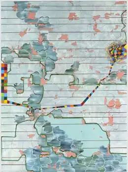 In the 2000s, Davis staked out an increasingly abstract and fluid position in canvases that resembled maps or networks and explored systemic, documentary and narrative impulses.[1][6][8] Situated more purely in painting, they dispensed with collage elements but retained that aesthetic through a dense layering of imagery and techniques.[1][6] Davis approached subject matter in a more subtle, open-ended manner balanced with formal concerns, expanding earlier examinations of racial, gender and identity codes into evocations of wider knowledge systems, often revealed as contingent and futile in terms of their ability to capture the plurality of life.[5][34][7][1]