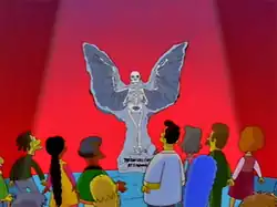 Before the trial even begins, the skeleton is seen outside the courtroom. Everyone rushes to it to see a foreboding message added to the skeleton, warning that "The End" will come at sundown. Sunset approaches and the citizens gather around the skeleton, but nothing happens. As Lisa reprimands them, a booming voice from the skeleton silences her and announces, "The End... of high prices!" The skeleton is then hoisted over to the entrance of the new Heavenly Hills Mall. Lisa realizes the whole event was a publicity stunt for the mall, and criticizes management for taking advantage of peoples' beliefs. She attempts to boycott them, but the bargain-loving public shrugs off the exploitation and goes shopping, while Dr. Gould confesses that he never actually tested the sample. Marge observes that while it was talking, Lisa believed the angel was real. She denies this, but admits she was frightened, and thanks her mother for her support.