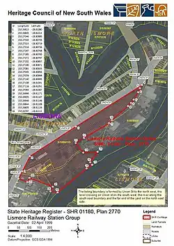 1. ^ a b c d e "Lismore Railway Station group". New South Wales State Heritage Register. Department of Planning & Environment. H01180. Retrieved 2 June 2018. Text is licensed by State of New South Wales (Department of Planning and Environment) under CC BY 4.0 licence.
