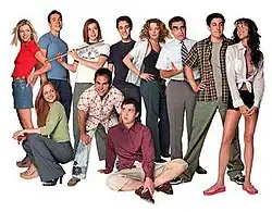 Characters from the series. From left to right: Vicky, Heather, Chris "Oz" Ostreicher, Michelle Flaherty, Steve Stifler, Kevin Myers, Paul Finch, Jessica, Noah Levenstein, James "Jim" Levenstein and Nadia. Picture from 2001.