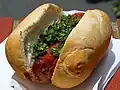 Choripán sandwich a sandwich made with chorizo or sausage between two halves of a small French loaf. It is sometimes topped with chimichurri sauce.[2]