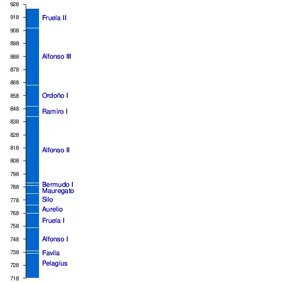 | Munia of Álava ≈740-780 | Fruela I the Cruel King of Asturias ≈722–757-768 | Vimarano ?-765 | Adosinda ?-785 | Silo King of Asturias ?-774-783 | Mauregato King de Asturias ?-783-789 | Creusa ?-789 | Bermudo I the Deacon King of Asturias ≈750–788– 791-797 | Aurelius King of Asturia ≈740–768-774 | |||||||||||||||||||||||||||||||||||||||||||||||||||||||||||||