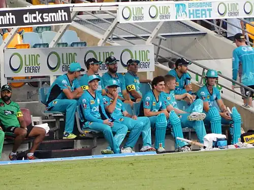 Brisbane Heat players on bench during Heat's innings, 28 December 2014.