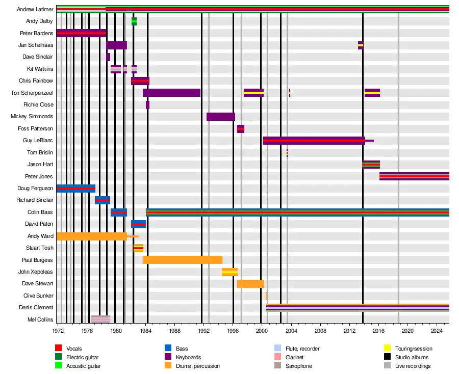 | Dave Sinclair | 1978–1979 | Breathless (1978) – two tracks only | ||