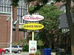 Tim Hortons, currently owned by Restaurant Brands International,[50] opened its first store on May 17, 1964, in Hamilton, Ontario.[51] It is the fourth largest publicly traded quick-service restaurant chain in North America based on market capitalization, and the largest in Canada.[52] It has cornered the Canadian market for baked goods (76%) and coffee (62% compared to Starbucks, in the number two position, at 7%).[53] The company has experienced substantial growth in the United States, where it has 613 stores (April 2011, about 220 more than it had in June 2008).[54][55] It has a same-store sales growth rate of 3.9% in Canada and 4.9% in the US.[56] The new partnership with Cold Stone Creamery helped push its US presence to over 600 stores. The partnership has since dissolved.[57] Sales exceeded $2 billion in 2008. It was controlled by Wendy's International Inc. for 11 of the 46 years of operation, from August 8, 1995, until the end of 2006. On April 3, 2011, Tim Hortons oversaw 3,782 locations in North America 3,169 of which were in Canada.[54]