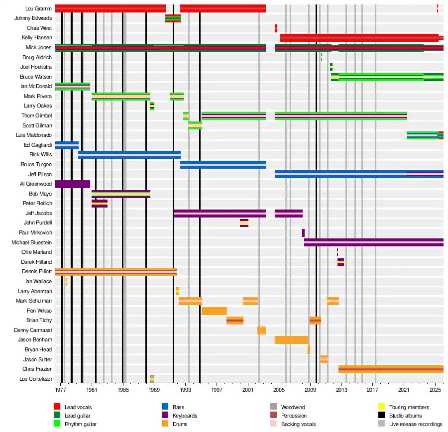 The band's current lineup includes lead guitarist, keyboardist and vocalist Mick Jones (since 1976, and the only remaining original member), bassist and keyboardist Jeff Pilson (since 2004), lead vocalist Kelly Hansen (since 2005), keyboardist Michael Bluestein (since 2008), rhythm and lead guitarist Bruce Watson (since 2011), drummer Chris Frazier (since 2012), and rhythm guitarist, vocalist and bassist Luis Maldonado (since 2021).[1]