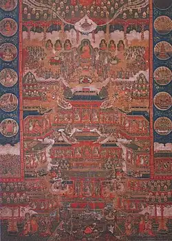 | Visualization of the Hwaom Pure Land | C13 | five main buddhas are at the bottom, fifty-two bodhisattvas descend on clouds; ink, colour, and gold on silk; sold at Christie's in 2003 | ![]() |