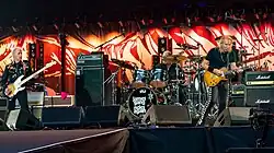 Since their original breakup, James Gang's classic lineup of Joe Walsh, Dale Peters and Jimmy Fox have temporarily reunited on several occasions. The first time was in July 1991, when they performed "Funk #49" during a Walsh solo show.[14] Next, the group played at an election rally for Bill Clinton in November 1996,[7] followed by a performance on The Drew Carey Show in 1998.[15] In February 2001, the trio (joined by keyboardist Mark Avsec) played three shows at the Rock and Roll Hall of Fame and Allen Theatre in Cleveland.[16] During August and September 2006, the band performed its longest reunion tour to date in the US.[17] For the shows, the core trio were joined by keyboardist Bill Appleberry, plus backing vocalists Gia Ciambotti, Robbyn Kirmsse and Stacy Michelle.[18] The band performed at the Taylor Hawkins Tribute Concerts at Wembley Stadium and the Kia Forum in September 2022.[19] On November 13, 2022, supported by Mark Avsec and a vocal trio, and joined on their encore by Dave Grohl on drums, the group performed at the VetsAid concert in Columbus, Ohio. While this was billed as "One Last Ride" for the James Gang,[20] Joe Walsh later raised the possibility of more James Gang performances.[21]