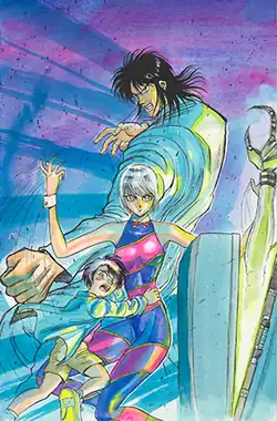 The three main characters from the series (from left to right): Masaru Saiga, Éléonore "Shirogane" Saiga, and Narumi Katō