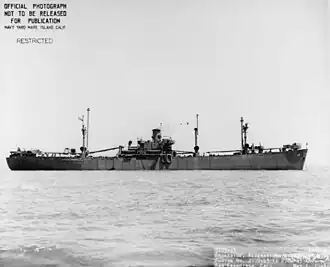Basilan was built by Delta Shipbuilding Company. Her keel was laid on 5 February 1944. She was launched as Jacques Philippe Villere on 21 March.[5] Completed at the Waterman Steamship Corporation's yard at Mobile as Basilan for the United States Navy.[14] Delivered on 21 April.[5] A repair and supply ship, she was laid up in Suisun Bay in 1947.[4] She was sold to a shipbreaker in Portland, Oregon in June 1972.[14]