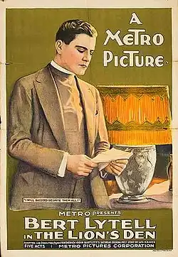 Metro Pictures Corporation was a motion picture production company founded in 1915 in the United States. It was, along with Goldwyn Pictures and Louis B. Mayer Pictures Corporation, one of the forerunners of Metro-Goldwyn-Mayer. The company produced its films in New York, Los Angeles, and sometimes at leased facilities in Fort Lee, New Jersey.[1] Metro Pictures was founded as a film distribution company in February 1915 by a number of "exchange men" with Richard A. Rowland as president, George Grombacher as vice-president and Louis B. Mayer as secretary.[2] It soon also began producing its own films, with Sealed Valley being Metro's first production, which was released on August 2, 1915.[3]
