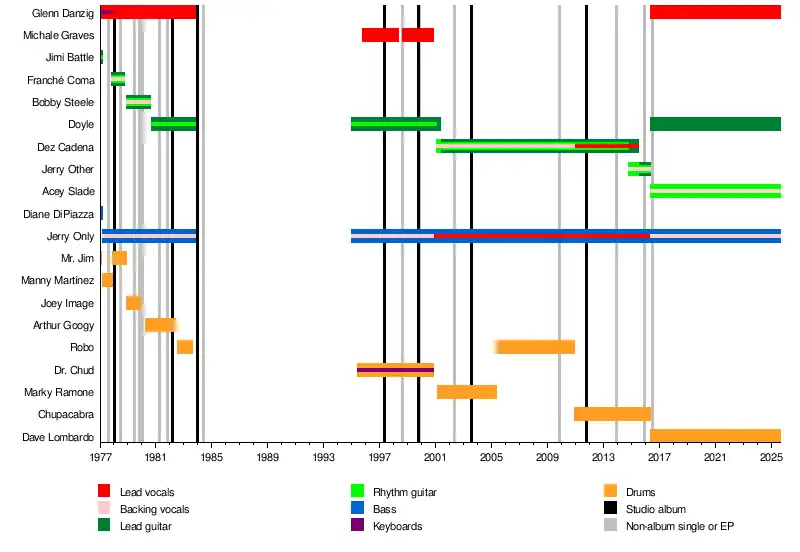 Graves and Chud left midway through a show on October 25, 2000.[20] Several guest musicians replaced them at later dates, including former member Joey Image, vocalist Zoli Téglás and drummer Ken "Renfield" Schalk.[20] In early 2001, the group toured with a range of guests, including Eric Arce, former members Robo and Graves, former Black Flag guitarist Dez Cadena, and former Ramones drummer Marky Ramone.[21] Both Cadena and Marky later became official members,[22] before Doyle left the band in May 2001.[23] Robo returned to replace Ramone in May 2005,[24] remaining until November 2010 when he was replaced by Arce.[25] In 2014, the band expanded to a four-piece with the addition of Only's son Jerry Caiafa II on guitar,[26] although the following June it was announced that Cadena had to cease performing due to undergoing cancer treatment.[27]
