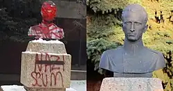 The bronze bust[17] of Ukrainian nationalist leader Roman Shukhevych, who collaborated with the Nazis from February 1941 to December 1942 as commanding officer of the Nachtigall Battalion in early 1941,[18] and as a Hauptmann of the German Schutzmannschaft 201 auxiliary police battalion in late 1941 and 1942,[19] units which were complicit in the Galicia-Volhynia massacres of ethnic Poles and in the Lviv pogroms (1941) against Jews. The bust was built in 1972 by Ukrainian World War II veterans on private land near the Ukrainian Youth Unity Complex in Edmonton, Alberta.[20][21][22][23] The statue was vandalised in 2019 when someone added the words "Nazi scum".[24] It was vandalised again in 2021 when someone added the words "Actual Nazi" in red paint.[21]