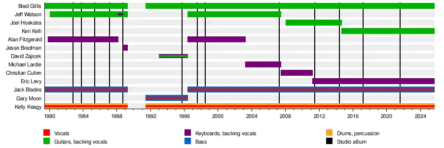 Following the addition of Hoekstra, the Night Ranger lineup remained stable for three years, until Eric Levy replaced Cullen on keyboards in March 2011.[13] Hoekstra remained for two studio albums and one live release, before it was announced in August 2014 that he was leaving to join Beach in Whitesnake.[14] He was soon replaced by Keri Kelli, who had previously substituted for Hoekstra during shows in 2012 and 2013.[15][16]