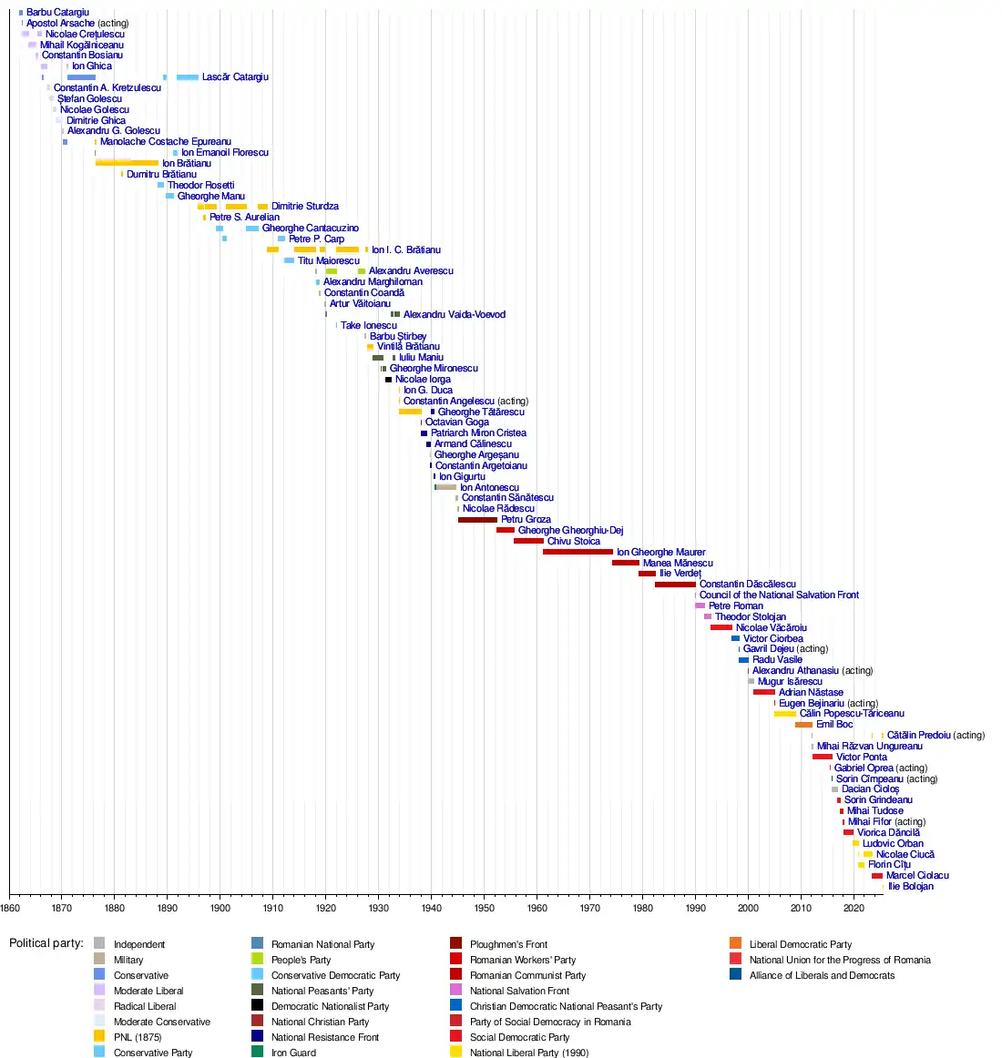 The political stance of Romanian prime ministers after the development of a modern party system is given by the following affiliations in the table below:
