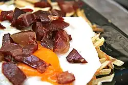 | Huevos rotos ("broken eggs") | everywhere | egg dish | fried eggs accompanied by French fries and some kind of meat (ham, bacon or a sausage like chorizo, longaniza or chistorra). | |