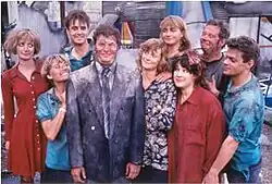 Main Characters of The Brittas Empire (left to right): Julie Porter (Judy Flynn), Linda Perkins (Jill Greenacre), Gavin Featherly (Tim Marriott), Gordon Brittas (Chris Barrie), Helen Brittas (Pippa Haywood), Laura Lancing (Julia St John), Carole Parkinson (Harriet Thorpe), Colin Weatherby (Mike Burns), Tim Whistler (Russell Porter)
