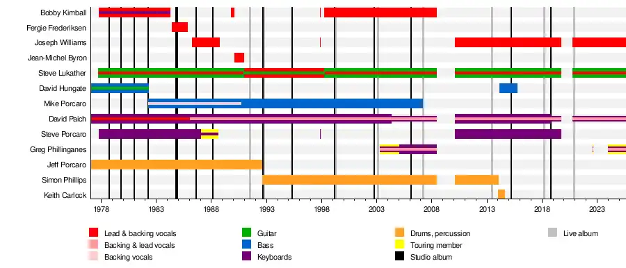 Toto is an American rock band from Los Angeles, California. Formed in 1977, the group's original lineup included lead vocalist Bobby Kimball, guitarist and vocalist Steve Lukather, keyboardist and vocalist David Paich, bassist David Hungate, keyboardist Steve Porcaro, and drummer Jeff Porcaro. The current lineup features constant member Lukather, and lead vocalist Joseph Williams (who originally joined in 1986, and rejoined in 2010). The band also tours with several additional musicians, currently bassist John Pierce (since 2020), drummer Shannon Forrest (since 2024, originally from 2014 to 2019), keyboardists Greg Phillinganes (since 2024, originally from 2003 to 2008) and Dennis Atlas (since 2024), and multi-instrumentalist Warren Ham (since 2017, and originally from 1986 to 1988). Paich is still in the band as a music director, but medically unfit to tour.[1] He still makes guest appearances at random select concert dates.