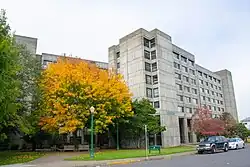 Named for university president Prince Lucien Campbell, PLC is home to many departments and a large auditorium.[n 30] The Oregon Companion described PLC as "...a pugnaciously ugly eight-story semi-skyscraper office building" and adds, "He deserved better."[n 31] Part of the Memorial Quad |