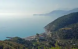 Numerous rivers flowing into the Adriatic Sea form bays, lagoons and inlets. The sand and silt they bring are deposited in areas of reduced flow, which form the sides of the bays, with narrow swales. The depositional coastline is characterized by a low elevation on a slightly uneven relief, with the presence of sandy beaches and lagoons aligned primarily in a North-South orientation.[3] Some areas of the coast are highlighted by sand dunes covered in Mediterranean vegetation. The coastal section of the Western Lowlands is continually expanding through land reclamation, while other areas of the coast experience erosive deterioration, as is the case in Patok, the Seman estuary and Lalzi bay. The Bay of Vlorë features high and rocky cliffs, particularly around the Karaburun Peninsula.[4]