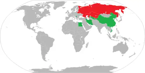 Free trade agreements of EEU. Red – EEU. Green – Countries that have FTA with EEU.