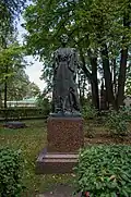 During the early Soviet period a number of monuments were stolen or destroyed. The cemetery was officially closed for burials in 1927, though they continued until 1932, and it was decided to turn it into a necropolis museum, displaying historically and artistically significant graves.[2][1] Alongside this was concept of gathering together the graves of the friends and contemporaries of Alexander Pushkin for the 1937 centenary commemorations of the poet's death. The architectural and planning department of Lensovet, the city administration, was tasked with creating a memorial park project.[2] Plans were drawn up by architects E.N. Sandler and E.K. Reimers, with further input from the city's chief architect L.A. Ilyin.[2] The Funeral Affair Trust was established to run the necropolis museum, including removing abandoned gravestones for sale as building materials.[4] The reconstruction radically altered the nature and appearance of the Tikhvin cemetery. With the intention being to create an "artists' necropolis", graves of those from other sections of society were removed. Fewer than a hundred of the original monuments were preserved.[2] Meanwhile, the remains of prominent artists, sculptors, composers and musicians were reburied in the cemetery. Among them were personal friends of Pushkin, including Konstantin Danzas, Anton Delvig, and Fyodor Matyushkin.[2]
