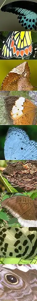 India has extremely diverse terrain, climate and vegetation, which comprises extremes of heat cold, desert and jungle, of low-lying plains and the highest mountains, of dryness and dampness, islands and continental areas, widely varying flora, and sharply marked seasons.[1] India forms a large part of the Indomalayan biogeographical zone; many of the floral and faunal forms show Malayan affinities with some taxa being unique to the Indian region. In addition, India hosts three of the world's biodiversity hotspots: the Western Ghats, the Eastern Himalayas, and the hilly ranges bordering India and Myanmar, each having numerous endemic species. Accordingly, India's diverse and varied fauna include a rich variety of butterflies and moths. Brigadier William Harry Evans recorded approximately 1439 species of butterfly from British India, including Ceylon and Burma.[2] After 1947, the rise of several new nations led to a reduction of the area forming part of India proper, and the number of species has been noted to be an estimated 1318 species.[3]