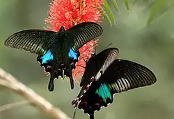 Indian swallowtails are spread over all the biomes/ecoregions of India. The Malabar banded peacock (Papilio buddha) and the Malabar banded swallowtail (Papilio liomedon) fly at sea level while the Apollos (Parnassius species), are to be found only in the highest alpine meadows of the Himalayas. Some species such as the common Mormon (Papilio polytes) and the blue Mormon (Papilio polymnestor) fly at ground level whereas others, such as the tailed jay (Graphium agamemnon) are normally found flying high in the forest canopy. The lime butterfly (Papilio demoleus) is a creature of arid scrub-land, occasionally being spotted even in the Thar Desert, while the tropical evergreen forests have their own representatives, such as the red Helen (Papilio helenus), the common bluebottle (Graphium cloanthus) and the Malabar raven (Papilio dravidarum).[3] Indian papilionids such as the common Mormon (Papilio polytes) and great Mormon (Papilio memnon) show polymorphism with many mimetic female forms.[4][5]