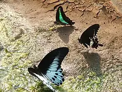 Blue Mormon (Papilio polymnestor), common Mormon (Papilio polytes) and common bluebottle (Graphium sarpedon). (left to right anticlockwise)