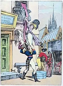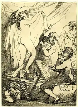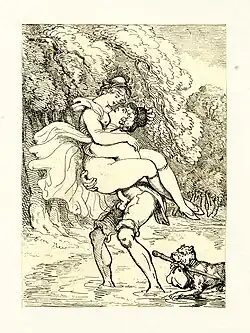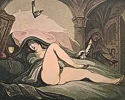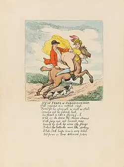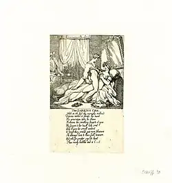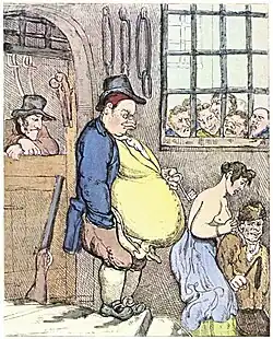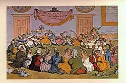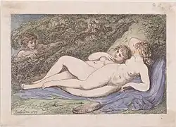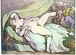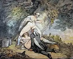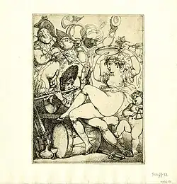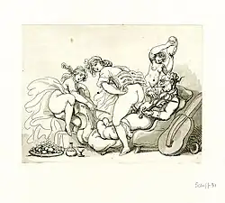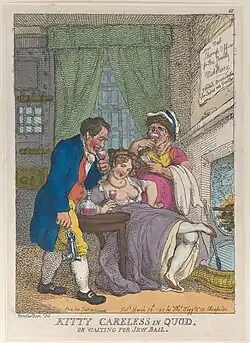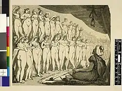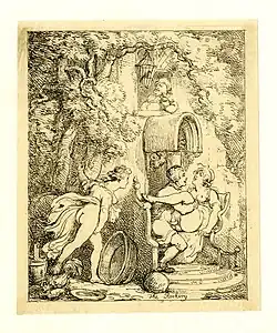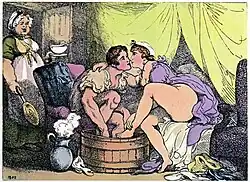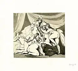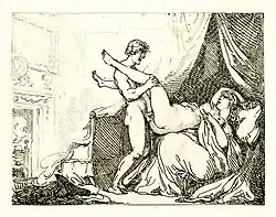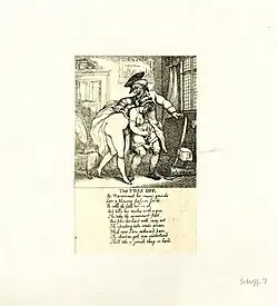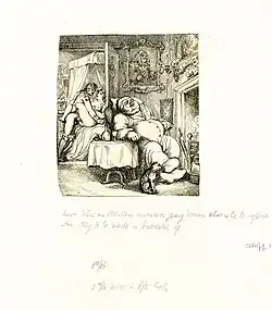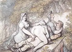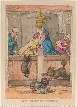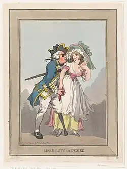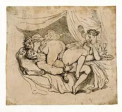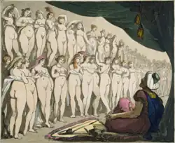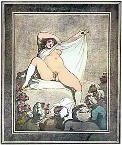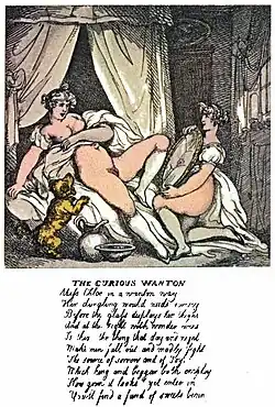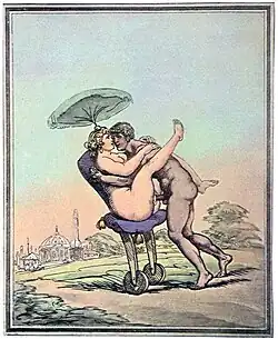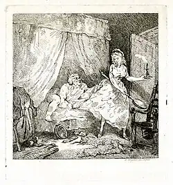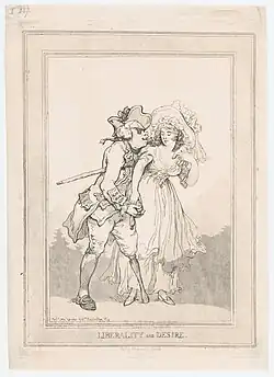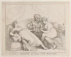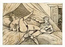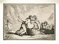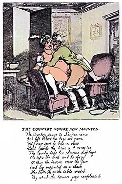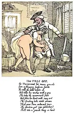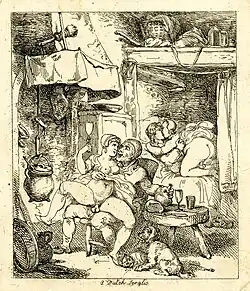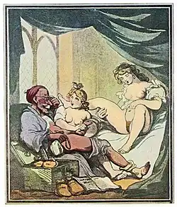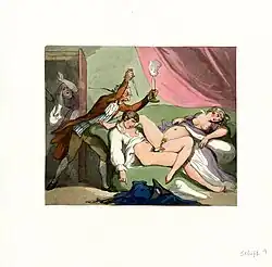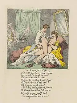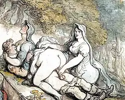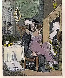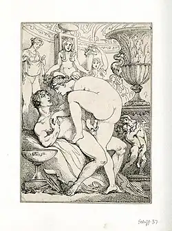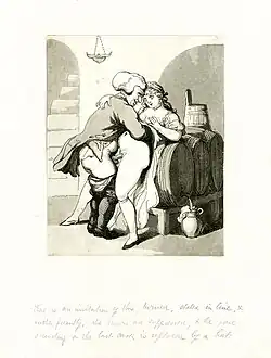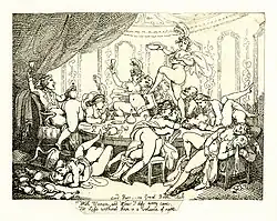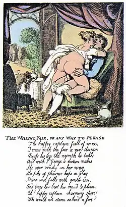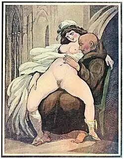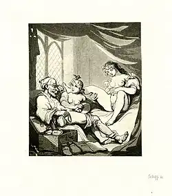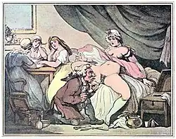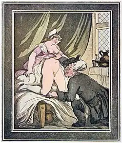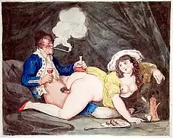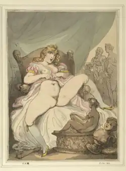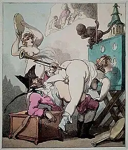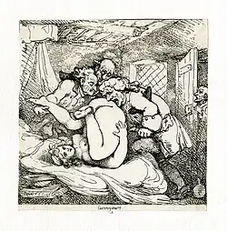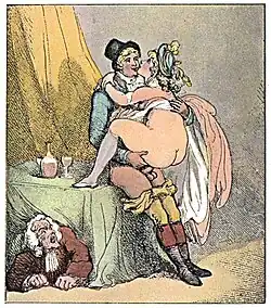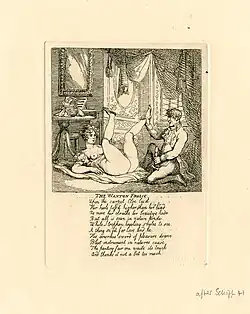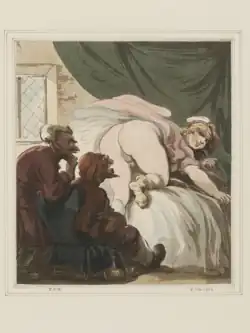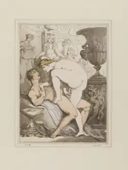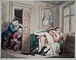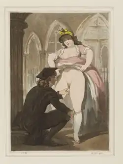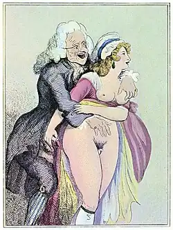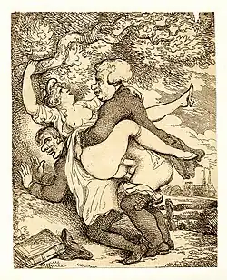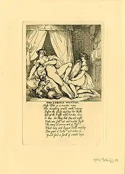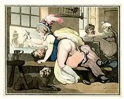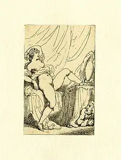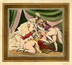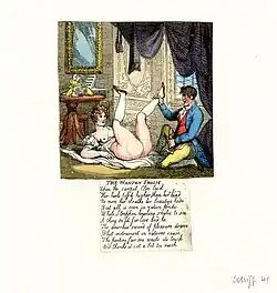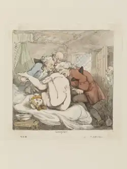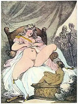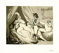 This is a descriptive list of erotic etchings and drawings by Thomas Rowlandson, based upon the research of Henry Spencer Ashbee published in his three-volume bibliography of curious and uncommon books: Index Librorum Prohibitorum (1877), Centuria Librorum Absconditorum (1879) and Catena Librorum Tacendorum (1885). Many of the works cited by Ashbee have been reprinted in Gert Schiff's The Amorous Illustrations of Thomas Rowlandson (1969) and Kurt von Meier's The Forbidden Erotica of Thomas Rowlandson (1970). The list also includes a few satirical and political caricatures and some which are merely free or indecent but not erotic or obscene.[2]