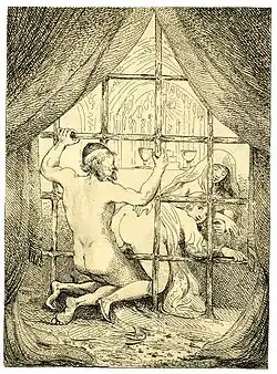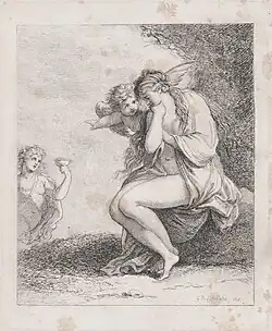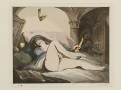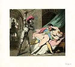 ———— A couple, almost naked, upon a couch, are surprised by a spectre in armour, who brandishes an axe over them; great horror is depicted upon the faces of the guilty pair. The apartment is that of an ancient castle; and to the left is an equestrian statue in armour. "The drawing is not always quite correct, and the execution is rough; but there is much vigour in the figures on the couch, particularly in that of the woman."[86]