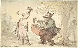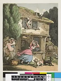 Jolly Gipsies Exterior. A young man and woman, quite naked, are in the act upon the ground under a tree; other gipsies a little distance off are disporting themselves; there is a pot suspended on three sticks over a fire. To the right are two dogs copulating; and to the left are two asses. "[T]he animals, as is usual with Rowlandson, are vilely drawn; the central couple display much vigour."[39] [40][41]