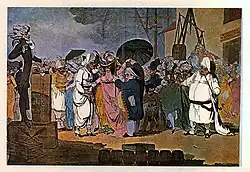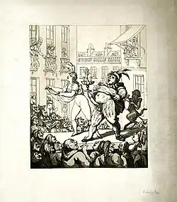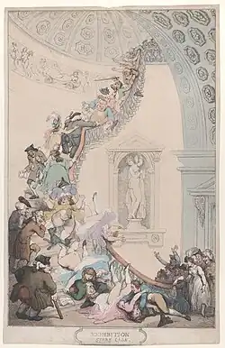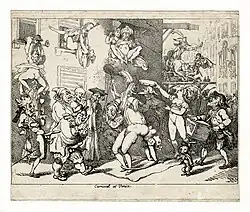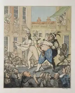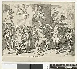 Carnival at Venice A street. There are numerous figures, the central one of which is a naked girl standing on hands and feet backwards in a hoop. Another naked girl is collecting money from the spectators; and a man is playing a barrel-organ. The spectators are strongly caricatured, and have their members exposed. At three windows overlooking the street, libidinous scenes are being enacted; and at the corner of the street, a quack is administering a clyster to a woman kneeling on a platform. "The composition is very clever and satirical, and is a good specimen of Rowlandson's talent."[8] [12]
