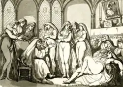 Inquest of Matrons or Trial for a Rape Interior. The design is divided: to the right a woman, almost naked, is stretched on her back upon a bed, while four old crones are examining her; the left shows us the court with the judge on the bench, the prisoner before him, lawyers, and others in their places; an old man of repulsive ugliness is peeping through the door at the examination of the woman. "The drawing is not good, and the etching is very rough, but the composition is original and striking."[39]