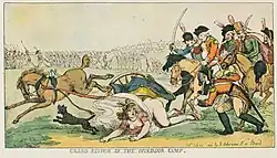 Empress of Russia reviewing her Body Guard Exterior. A very fat, middle aged woman is leaning against a cannon, her clothes are up above her waist, and a hussar, pipe in mouth, is enjoying her. Several other hussars, their members exposed, stand or sit around. Titled by Schiff: "The Empress of Russia Receiving her Brave Guards";[117] by Von Meier: "Catherine the Great".[20] [118]